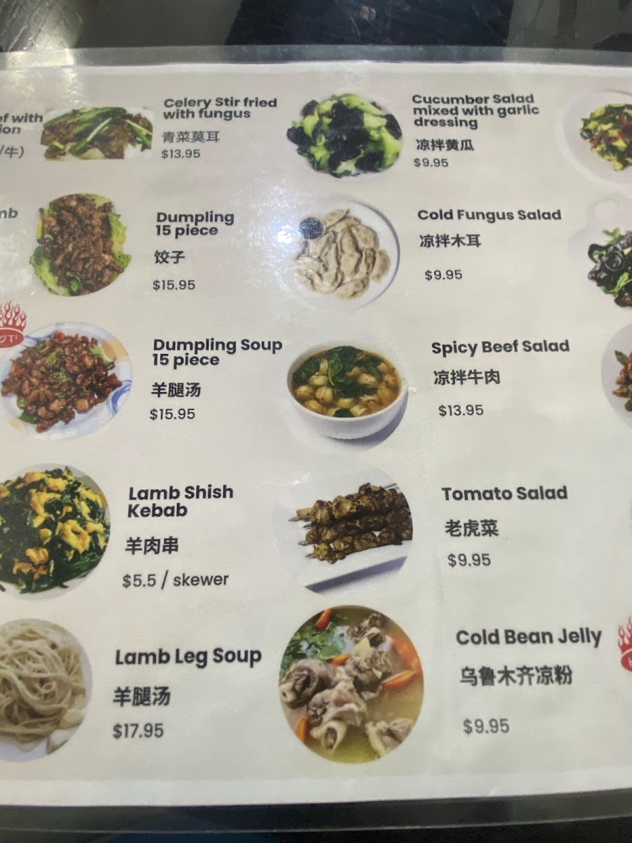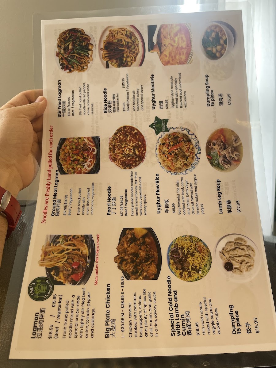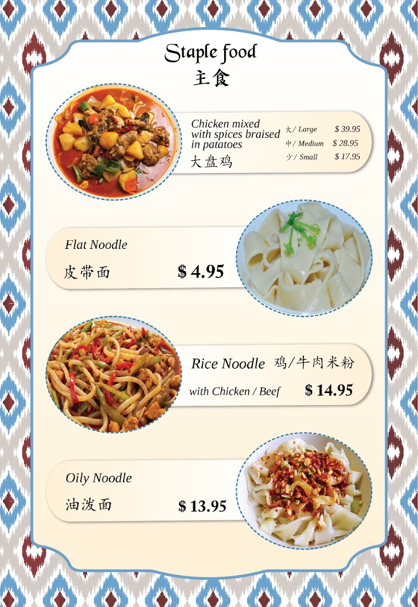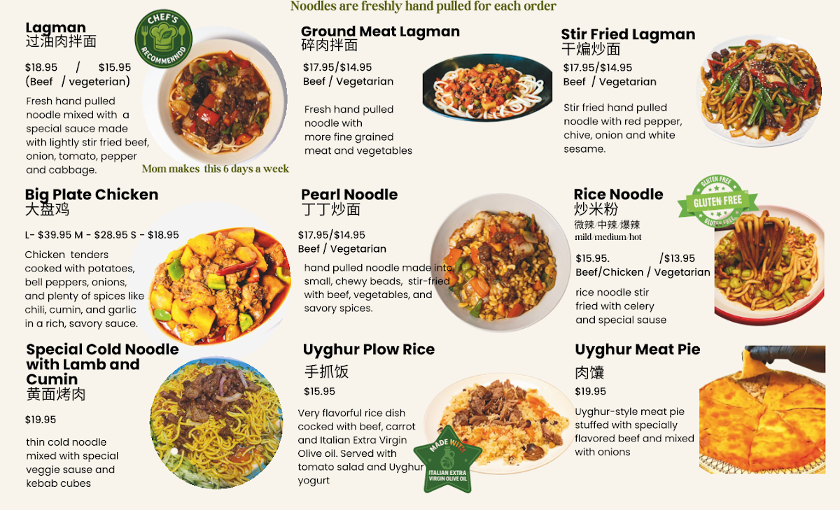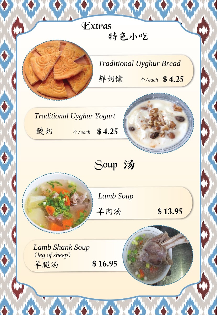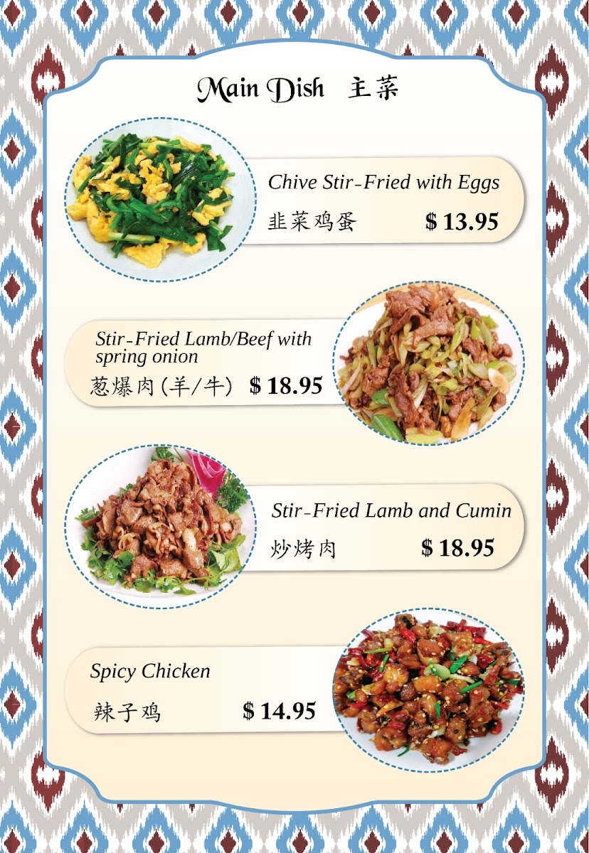 When it comes to the menu, you’ll discover an array of tantalizing dishes that will awaken your taste buds. Start your meal with a plate of Stir Fried Lamb with Cumin (炒烤肉) or the flavorful Spicy Pepper Chicken (辣子鸡), both priced at US$19.95. For a more unique experience, don’t miss the Lagman, a freshly hand-pulled noodle dish that comes in several variations. The Ground Meat Lagman is a superb choice, featuring a blend of fine-grained meat and vegetables, all for just US$17.95. This dish epitomizes the robust flavors that Uyghur cuisine has to offer, making it a must-try.