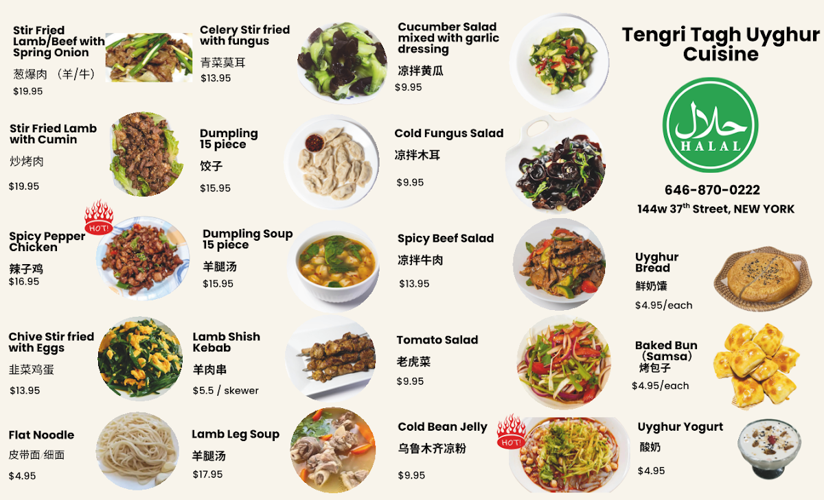 If you're in New York City and looking to explore the unique and vibrant flavors of Uyghur cuisine, look no further than Tengri Tagh Uyghur Cuisine. Located at 144 W 37th St, New York, NY 10018, this Halal restaurant offers a culinary journey that fuses elements from Central Asian, Chinese, and Middle Eastern traditions. Perfect for adventurous foodies and those seeking Halal options, Tengri Tagh is an experience not to be missed.